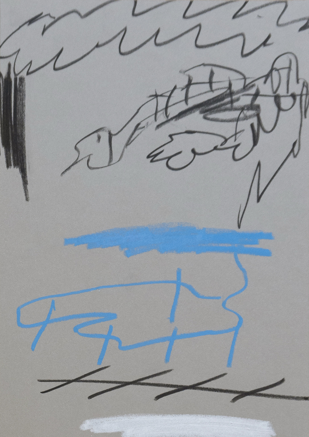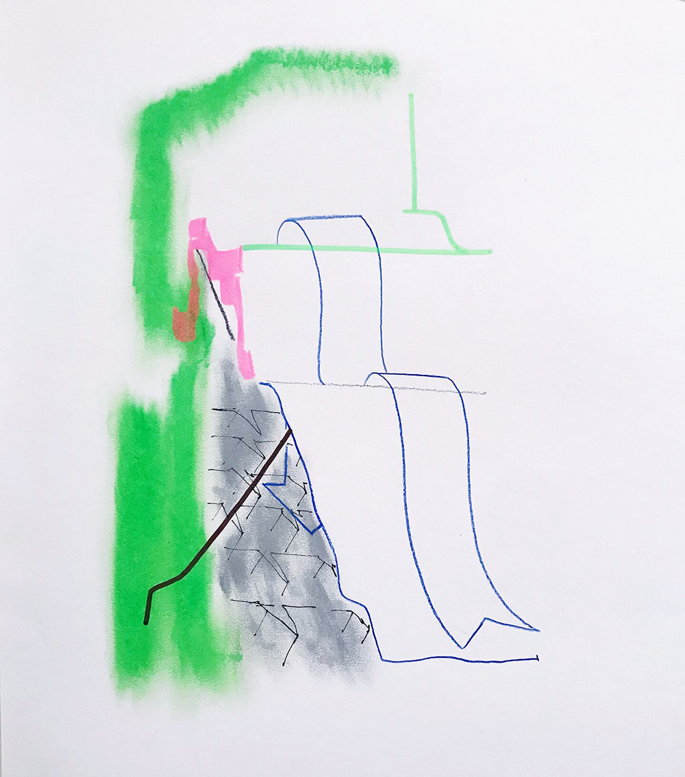 Acrylic marker, coloured pencil and oil pastel on paper,
